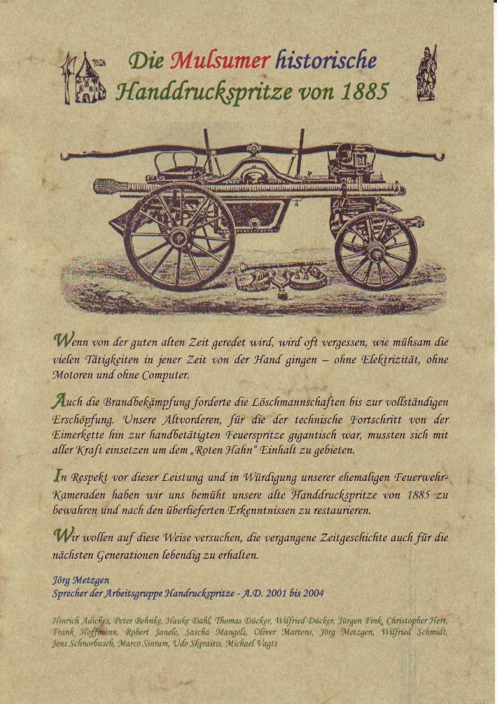 Im November 2001 trat die Arbeitsgruppe "Handdruckspritze von 1885", nach symbolischer Außerdienststellung des Feuerlöschgerätes, erstmalig für die besprochene Aufgabenstellung zusammen.
